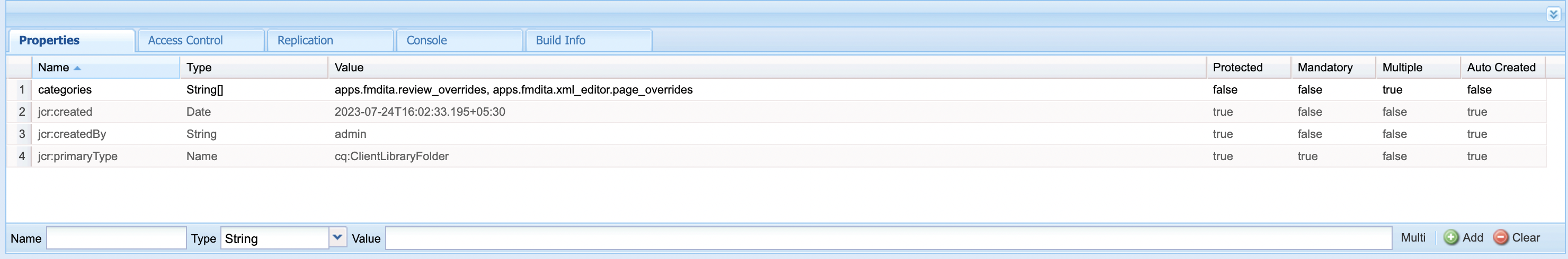 propertiesof the node, selectMultiadd the following property Name:categoriesType:String []Value:apps.fmdita.review_overrides,apps.fmdita.xml_editor.page_overrides